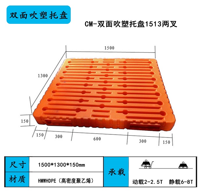 中空吹塑塑料托盤(pán)的生產(chǎn)與一般的中空制品吹塑成型方法相類似,因其產(chǎn)品較大,且為雙面型,需要較大的擠出機(jī)、合模機(jī)及模具等。目前國(guó)內(nèi)中空成型機(jī)制造廠家已經(jīng)研發(fā)出專業(yè)高速生產(chǎn)高強(qiáng)度吹塑托盤(pán)的超大型中空成型機(jī),采用HDPE(低壓高密度聚乙烯)高強(qiáng)度塑料生產(chǎn),成型速度較快,產(chǎn)品質(zhì)量較好,具有高強(qiáng)度、壽命長(zhǎng)的特點(diǎn),一般吹塑托盤(pán)的使用壽命可以達(dá)到5~10年,同時(shí)可以在-40~70℃的環(huán)境下穩(wěn)定工作。其產(chǎn)品的動(dòng)載可以達(dá)到3t以上,抗彎強(qiáng)度均是較高的水平。是高強(qiáng)度使用環(huán)境的首選托盤(pán),目前其價(jià)格比注塑托盤(pán)偏高一些,但其使用壽命特別長(zhǎng),所以它的性價(jià)比是所有托盤(pán)中最高的。吹塑托盤(pán)隨著成型設(shè)備價(jià)格的大幅度降低,將會(huì)在近年內(nèi)獲得較快的發(fā)展。將對(duì)于節(jié)約有限的石油資源與物流成本有極大的好處。