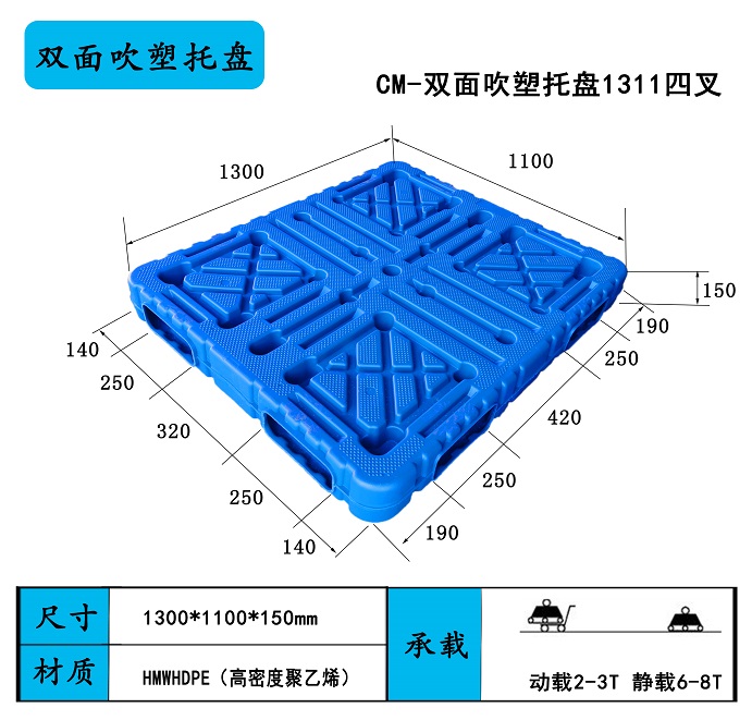 中空吹塑塑料托盤的生產(chǎn)與一般的中空制品吹塑成型方法相類似,因其產(chǎn)品較大,且為雙面型,需要較大的擠出機、合模機及模具等。目前國內(nèi)中空成型機制造廠家已經(jīng)研發(fā)出專業(yè)高速生產(chǎn)高強度吹塑托盤的超大型中空成型機,采用HDPE(低壓高密度聚乙烯)高強度塑料生產(chǎn),成型速度較快,產(chǎn)品質(zhì)量較好,具有高強度、壽命長的特點,一般吹塑托盤的使用壽命可以達到5~10年,同時可以在-40~70℃的環(huán)境下穩(wěn)定工作。其產(chǎn)品的動載可以達到3t以上,抗彎強度均是較高的水平。是高強度使用環(huán)境的首選托盤,目前其價格比注塑托盤偏高一些,但其使用壽命特別長,所以它的性價比是所有托盤中最高的。吹塑托盤隨著成型設(shè)備價格的大幅度降低,將會在近年內(nèi)獲得較快的發(fā)展。將對于節(jié)約有限的石油資源與物流成本有極大的好處。