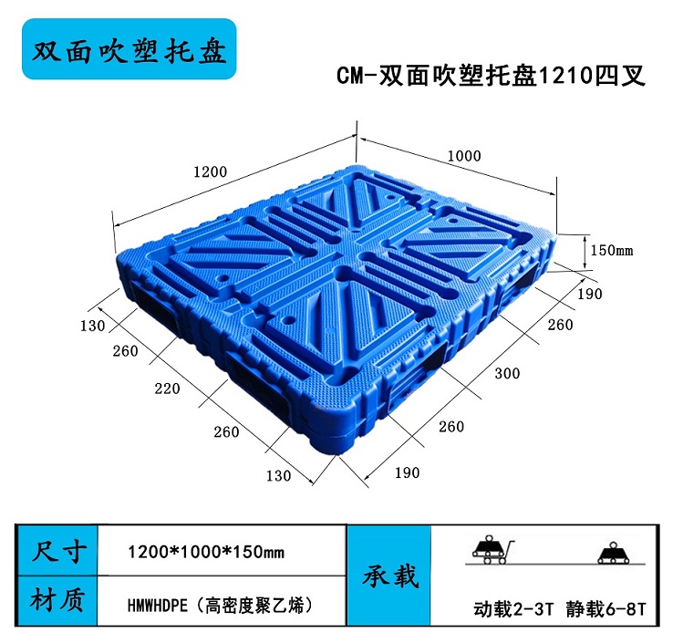 中空吹塑塑料托盤的生產(chǎn)與一般的中空制品吹塑成型方法相類似,因其產(chǎn)品較大,且為雙面型,需要較大的擠出機(jī)、合模機(jī)及模具等。目前國內(nèi)中空成型機(jī)制造廠家已經(jīng)研發(fā)出專業(yè)高速生產(chǎn)高強(qiáng)度吹塑托盤的超大型中空成型機(jī),采用HDPE(低壓高密度聚乙烯)高強(qiáng)度塑料生產(chǎn),成型速度較快,產(chǎn)品質(zhì)量較好,具有高強(qiáng)度、壽命長的特點(diǎn),一般吹塑托盤的使用壽命可以達(dá)到5~10年,同時(shí)可以在-40~70℃的環(huán)境下穩(wěn)定工作。其產(chǎn)品的動載可以達(dá)到3t以上,抗彎強(qiáng)度均是較高的水平。是高強(qiáng)度使用環(huán)境的首選托盤,目前其價(jià)格比注塑托盤偏高一些,但其使用壽命特別長,所以它的性價(jià)比是所有托盤中最高的。吹塑托盤隨著成型設(shè)備價(jià)格的大幅度降低,將會在近年內(nèi)獲得較快的發(fā)展。將對于節(jié)約有限的石油資源與物流成本有極大的好處。